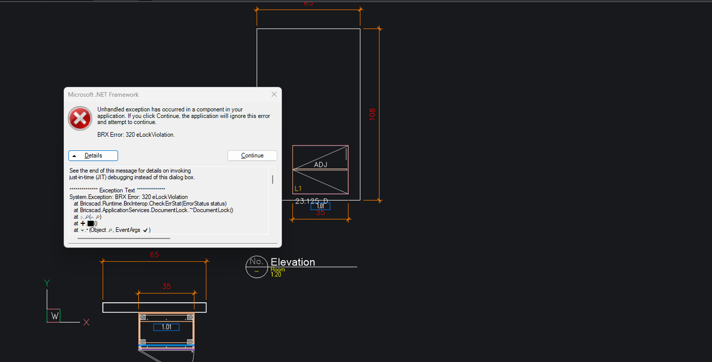 Fig. 4: The BSB error occuring when attempting to redraw a wall.- There was a reported issue with redrawing walls in 2D elevations in Toolbox BSB. Attempting to redraw a wall that has a product placed on it from the database, would result in an error occurring. This issue would only occur when a 2D elevation drawing was placed within the room, and a product placed against the wall. This issue has been resolved, and redrawing walls should no longer cause this error.