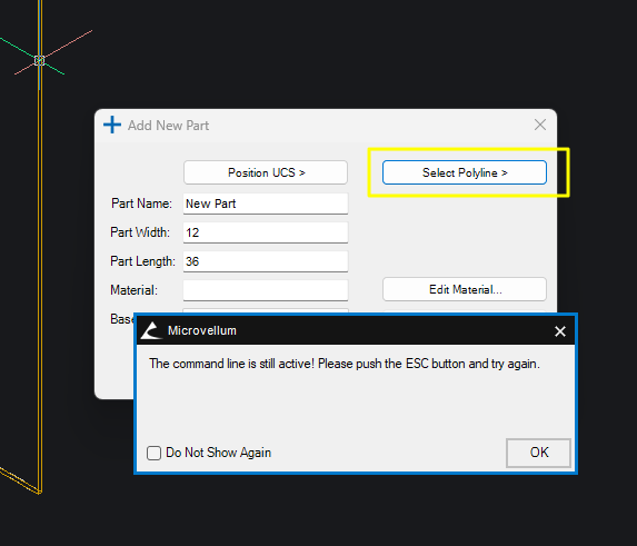 Fig. 3: The "Select Polyline" option and command line issue.- An issue was found when attempting to select a polyline to modify a part. Under the Modify tab, if one opened the “Add Part” interface and clicked “Select Polyline” while highlighting a product, which would ordinarily select the specific polyline in that model, it was found that one would instead receive a pop-up that the command line was still active, preventing one from selecting the polyline or modifying the intended part.