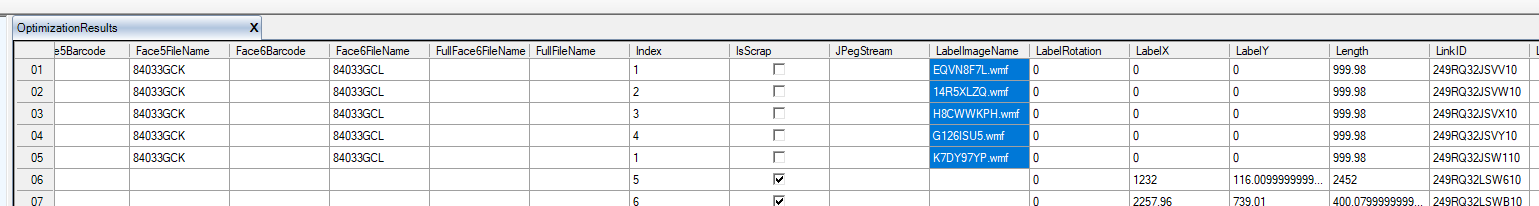 database structure of work orders: the LabelImageName column, which lists the
