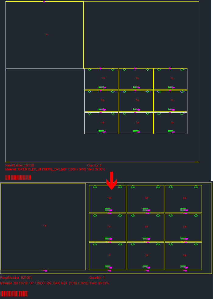 Fig. 1: Improperly placed drawer fronts (top). - When optimizing products with a perfect grained container in the operation, it was sometimes the case that parts would be placed incorrectly, not conforming to the order or placement laid out in initial drawings. Certain parts, such as drawers and drawer fronts, would sometimes be placed at the top of the sheet, despite not being intended or set to, for example.