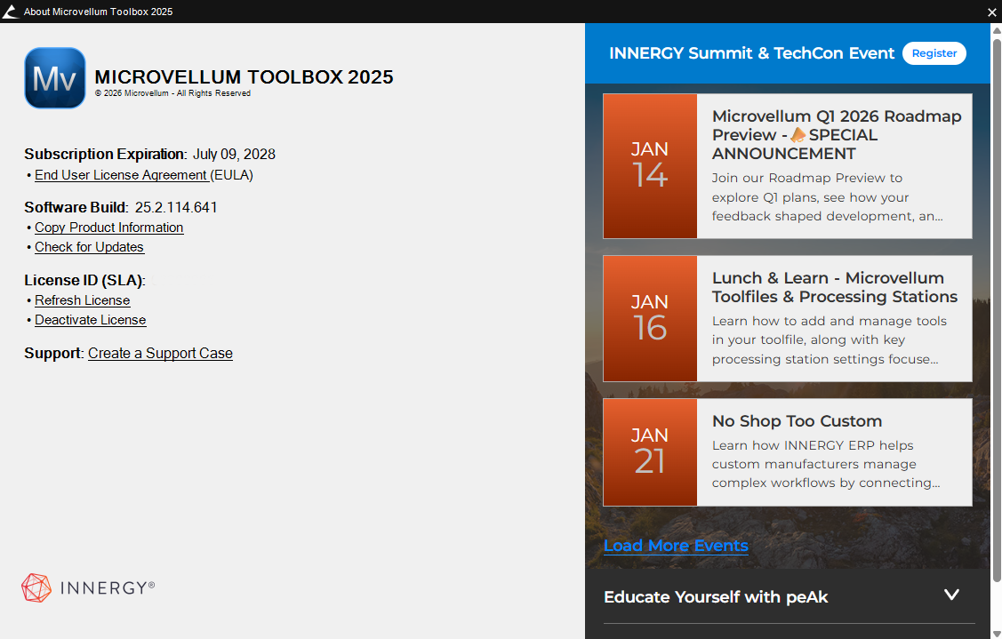 Fig. 4: The new layout of the "About Microvellum" UI.- Accompanying Microvellum’s subscription model changes, the About Microvellum interface has undergone a visual change, relocating multiple options to a more linear, seamless list, as well as removed the module tracking section of the interface, due to the full integration of all Software Modules.