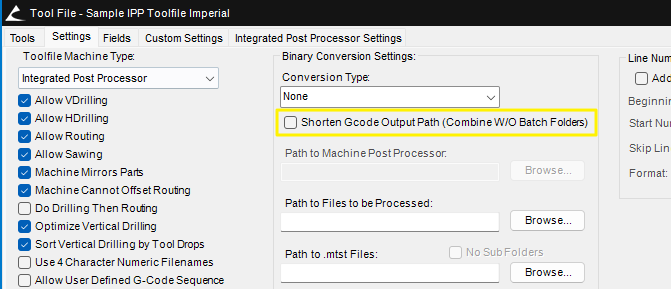 Fig. 3: The "Shorten Gcode Output Path" setting in the Tool File interface.- Users reported an issue with the Autolabeling setting, wherein label image files would sometimes be placed in the incorrect location. When “Shorten GCode Output Path” option is enabled, it is expected that all output files will be placed a single assigned folder location, being added to multiple newly created subfolders. Some users instead found that even with the setting enabled, new subfolders would be created for label image files. This issue has been resolved, and should no longer occur. With the setting enabled, label image files should be placed in a single folder, as intended.