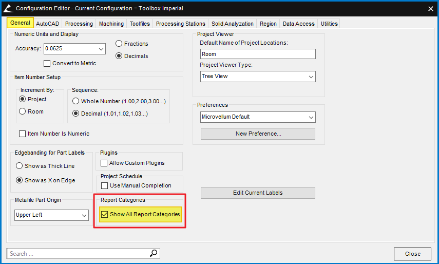 To address this issue, but still preserve access to all the reports from a single workstation running only Toolbox, the program has been modified to contain an option to view all report categories or only those that apply to Toolbox. Click “Toolbox Setup > Options > General.” Unchecking the box will cause Toolbox to display only the categories: manufacturing reports, product labels, and placed part labels.