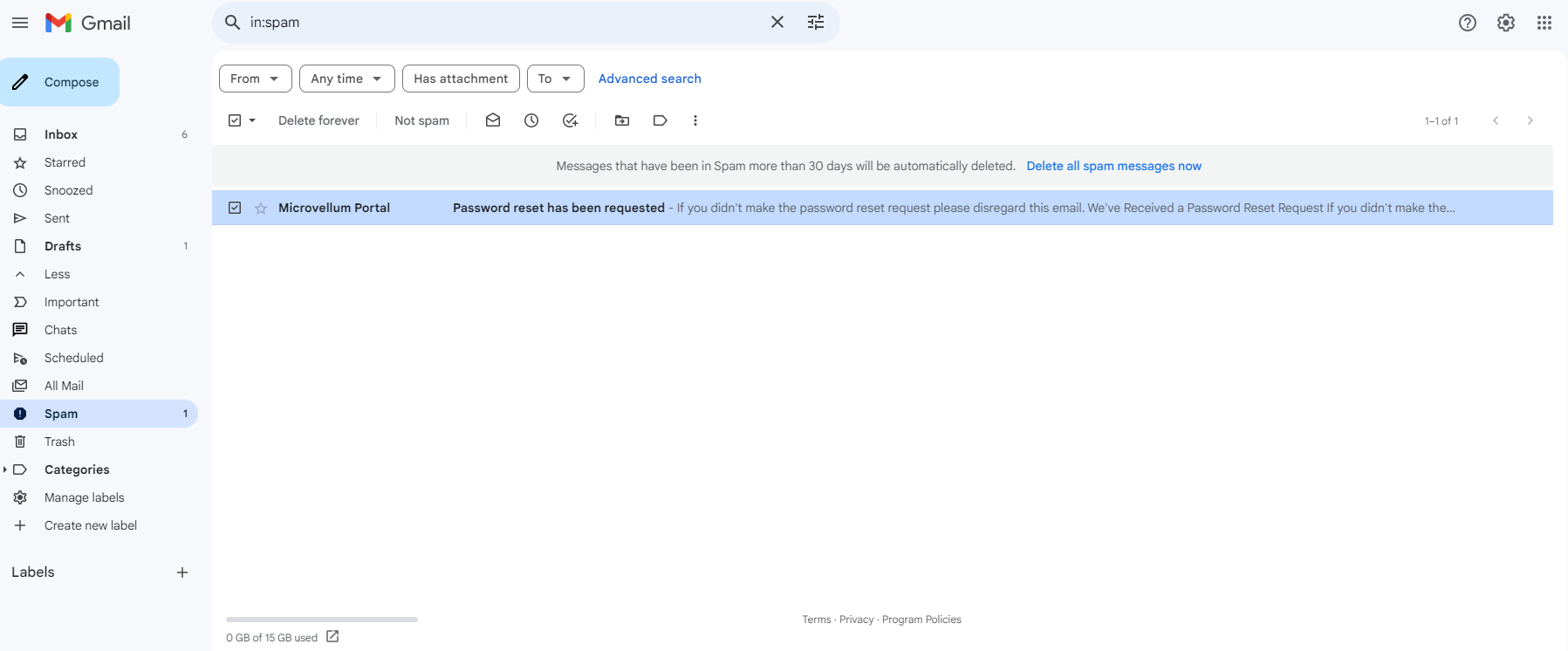Fig. 01- Microvellum Portal email under the "Spam" folder in Gmail.
