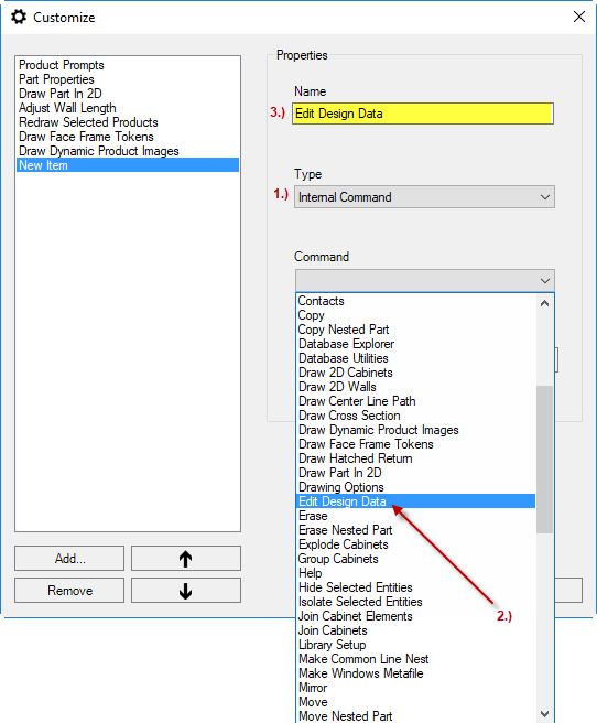 Click to display the Command List. In this tutorial, we are creating a button to edit the product design data, so we'll select Edit Design Data from the list. This automatically populates the name of the new command.