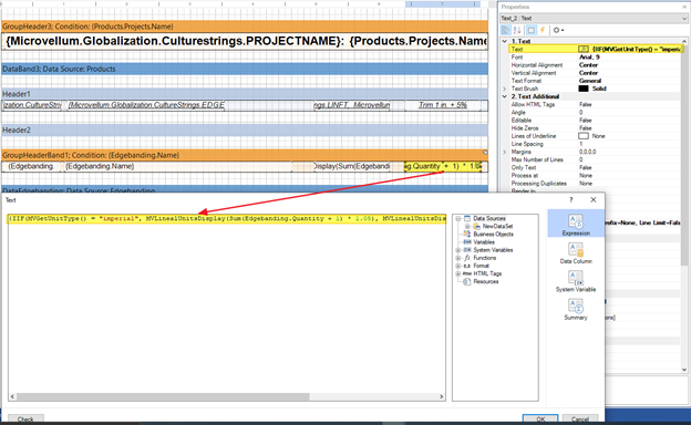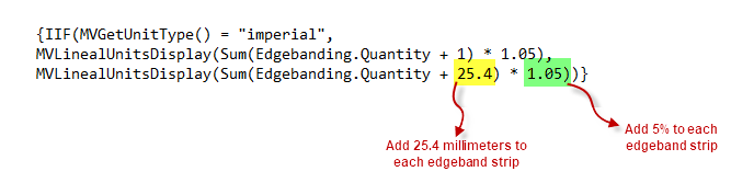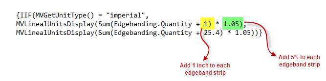 Adjust the expression in step 7 as needed to return your preferred waste factor. Figure 5 shows code that adds 1-inch plus 5% to each edgebanding strip. Figure 6 shows code that adds 25.4mm plus 5% to each edgebanding strip. You may modify the values highlighted in yellow and green as needed to add the desired waste in imperial measurement.