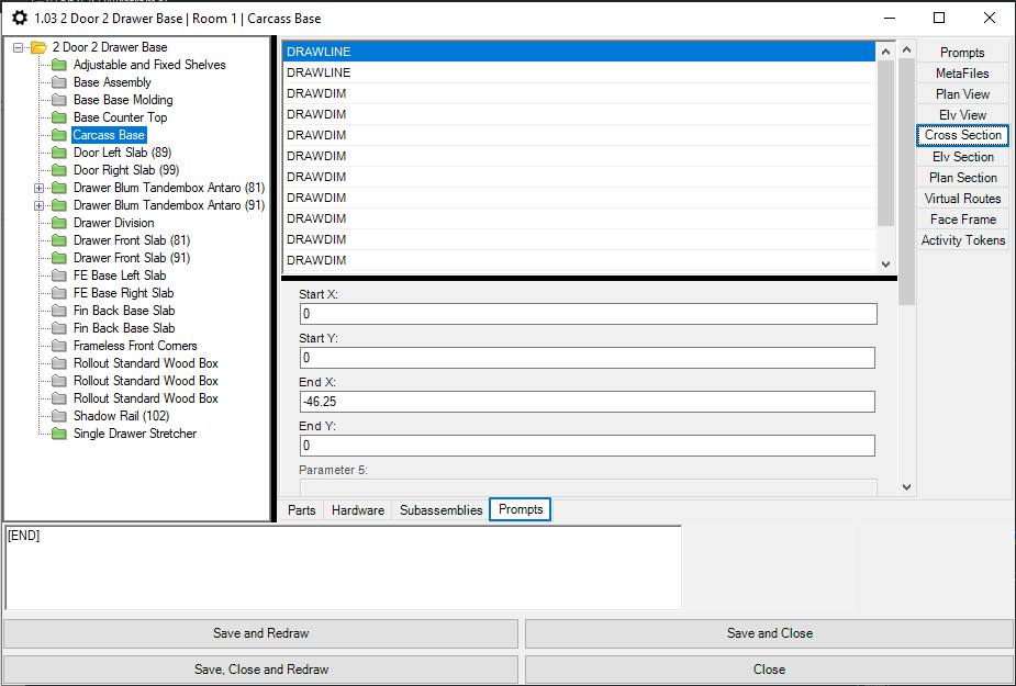 When working with the Prompts tools, selecting one of the drawing-instruction tabs on the right side of the screen will display all the drawing tokens for the selected product, subassembly, or nested subassembly. The image below shows the cross-section drawing tokens for a carcass subassembly.