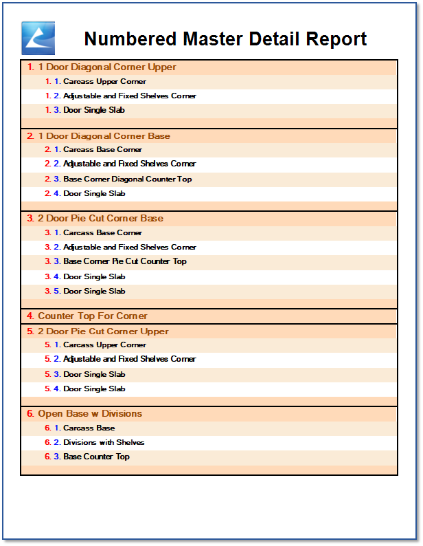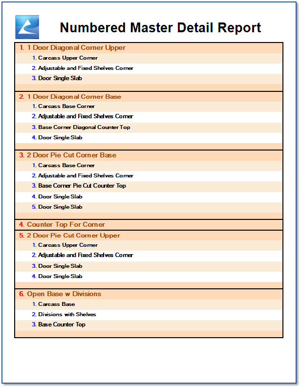 Just like with ordinary lists, the rows of a Master-Detail report can be numbered. However, there is one difference. When numbering is used in the Detail of the Data band, the numbering restarts for each sublist.