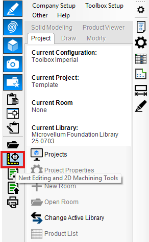 To access your nest tools, click on the Nest Editing and 2D Machining Tools icon in the Toolbox Palette's tool strip, near the lower section of the lefthand side of the interface.
