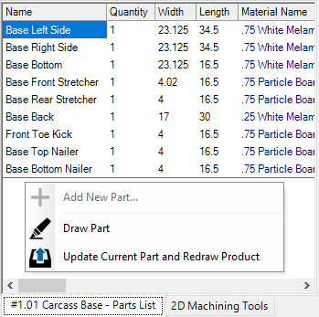 By selecting a part and then right-clicking, you can draw the part in 2D or update the product with the current changes that were made to the selected part.
