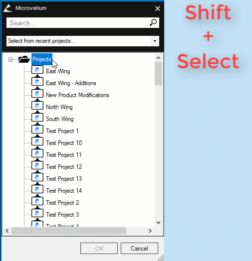 Multiple projects or rooms can be selected at once using either Shift + Select for selecting a range or Ctrl + Select for selecting a random assortment. Only items from the same level of the tree can be selected, and only if all of the selected items are of the same type. Attempting to select an ineligible item in the tree, with multiple items selected, deselects all previously selected items.