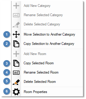 - Move Selection(s) to Another Category – Selecting this option allows the chosen category to be moved to another category. When a category is moved, all of the rooms and subcategories nested within it are also moved. Multiple categories can be selected and moved at once.