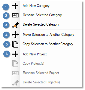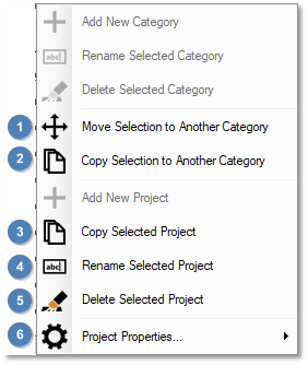 - Move Selection(s) to Another Category – Selecting this option allows the project to be moved to another Category Folder within the Tree View interface. Select this option and choose the folder that the project is to be moved to in the Select Category interface. Multiple projects can be selected and moved at once.