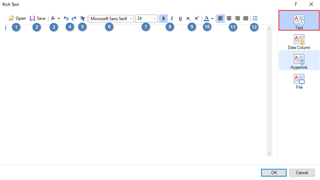 After inserting a RichText component into your report, you’ll find a special editor when you double-click it. This editor can change the font, load and save the RTF text, color, size, paste expressions, etc.. The RTF text can be modified with this editor without the need for a third-party editor. This editor contains the following tabs: