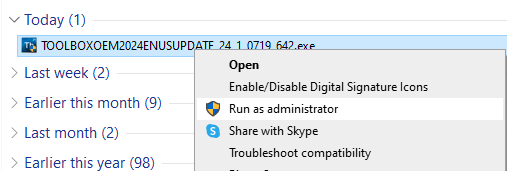 - Right-click on the Toolbox update installation file and select “Run as administrator."