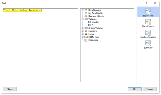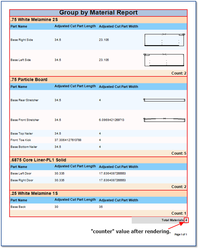 The counter variable increases by one each time a new group is rendered. The report in this example is grouped by materials, so counter is keeping track of the number of materials in the report.