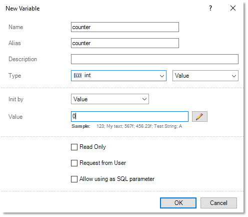 - From the New Variable window, create a new int type variable named “counter.” Assign it a value of “0.” See Figure 04.