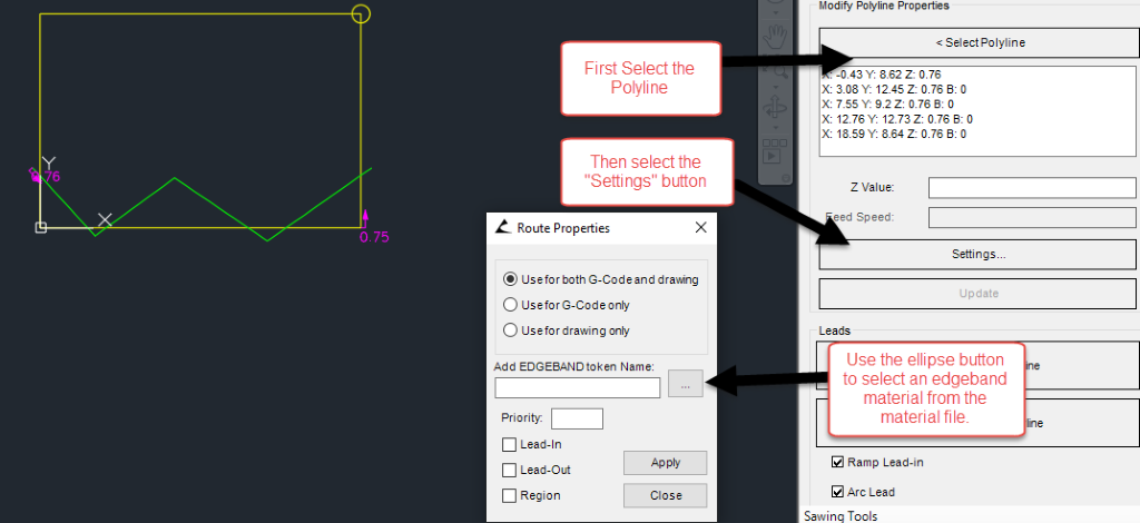 Next, select the ‘Settings’ button. In the Route Properties window, you can add an Edgeband name. If a valid material name is entered in this textbox, an EDGEBAND token will automatically be created and linked to this new polyline token. Use the ellipse button to select an edgeband material from the material file.