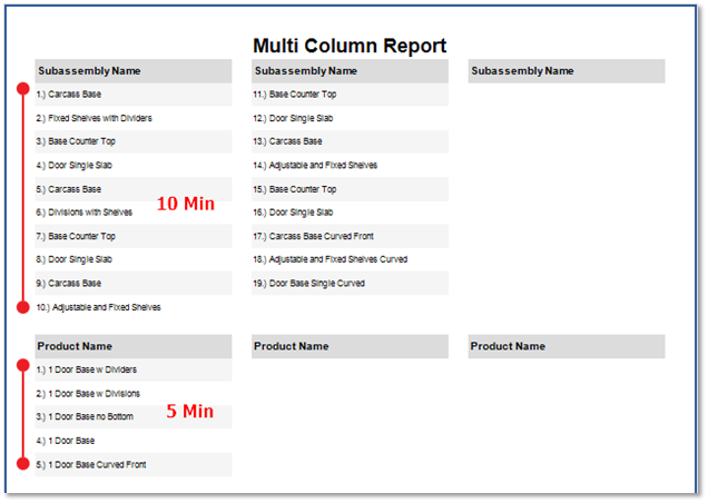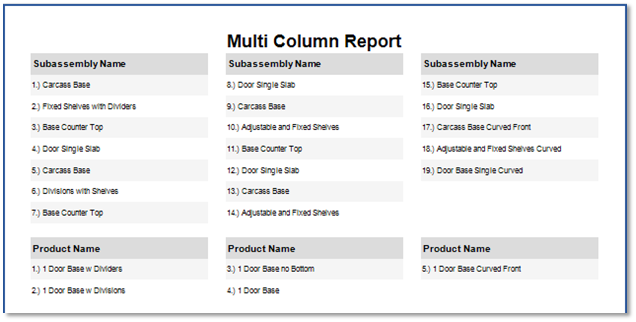 When the value of this property is more than zero, then this number is used to specify the number of rows that are output in the first column. In Figure 03, the Min Rows in Column property has been set to 10 for the Subassemblies list, and 5 for the Products list.