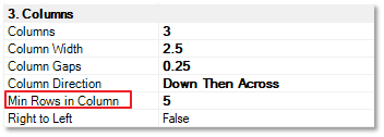 The Min Rows in Column property is used to set the smallest number of rows in the first column of your multi-column report.