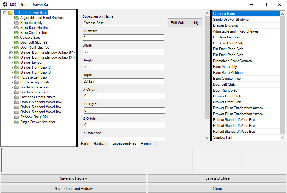 You will be allowed to edit the Subassembly Name, Quantity, Width, Height, Depth, the X, Y, and Z origins, the Z rotation, and Perfect Grain Info.