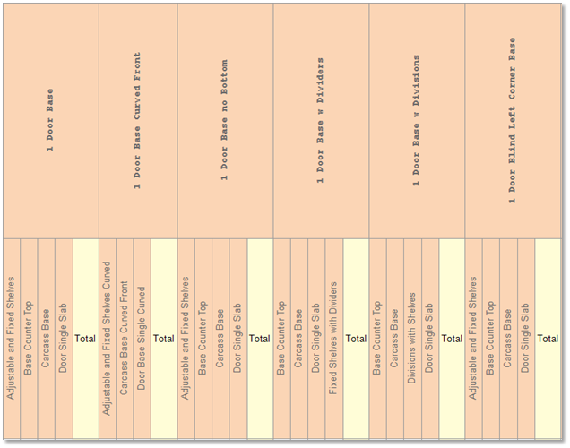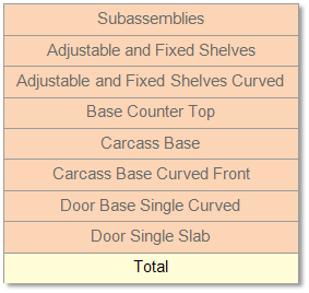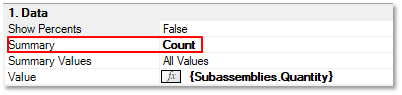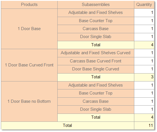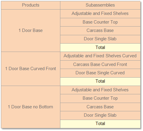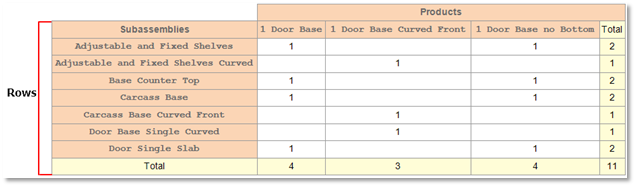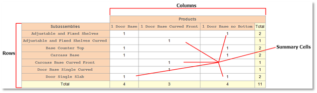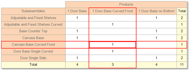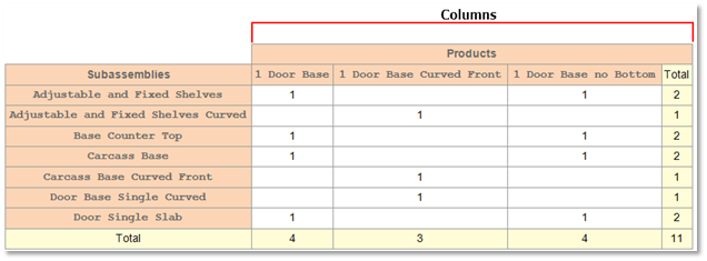 The red rectangle indicates the summary cell where the Product and the Subassembly meet. This can be read as a “1 Door Base Curved Front” has 1 “Carcass Base Curved Front.” The rules of the grouping can be set with the Summary property of a summary cell.